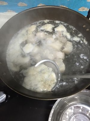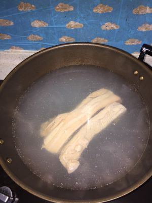 锅里烧开水,将清洗干净的肉放入锅内倒些许料酒将肉随便焯一下,肉有点硬就捞出,锅内水别倒掉