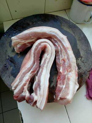 先把五花肉洗净切块,切成大概麻将大小方块。
