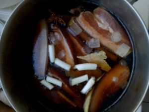 五花肉翻炒变色之后转入砂锅,加水没过肉块,转大火烧开之后转小火慢炖,大概一个小时。