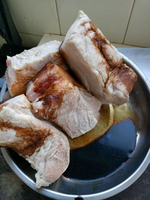 水烧开了煮到断生,捞出来晾干水分,表皮抹酱油,老抽,上色