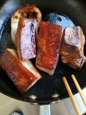 把肉切块然后放水里抄一下。由于家里来人比较急忘记拍照啦。这是已经炒好放在平底锅里煎肉皮的图片,把所有肉皮朝下小火把皮煎一下,吃起来的时候口感会更好。