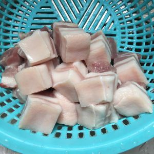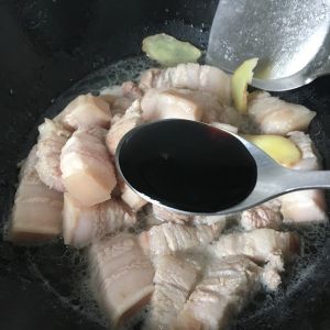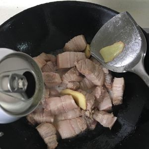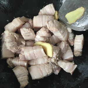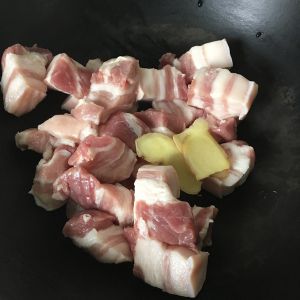 五花肉切块放入大勺小火慢煎至金黄色,然后把多余的油脂倒掉,只留一点点。