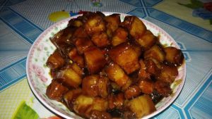 才发现没有步骤图阿。。成品图冒充下吧。首先五花肉洗干净后切成小方块加少许葱姜焯水。把血水飞掉。焯熟捞出过凉水洗干净。