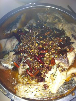 将煮好的鱼肉捞出,倒入放白菜、芹菜的盆中,另起油锅,将花椒、辣椒炒香倒到鱼肉上,即可