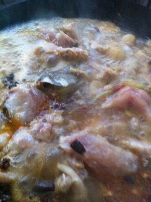 加入高汤(清水),将鱼头、骨放入汤中,加盐,煮开