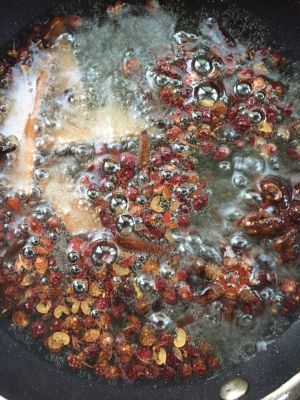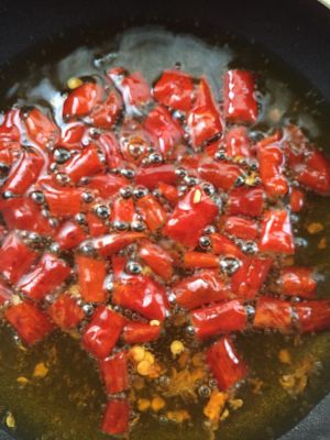 起油锅放入适量的(根据自己的口味)花椒、辣椒,葱姜,爆香,