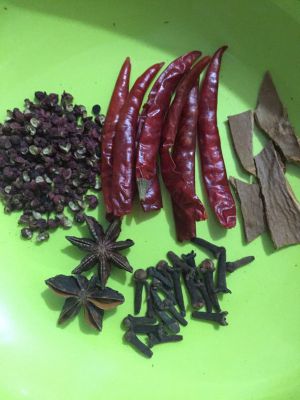 花椒、干辣椒、八角、丁香、桂皮待用,