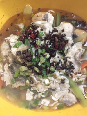 把腌制好的鱼片一片一片下入锅中,小火烫熟捞出铺在烫熟的配菜上,撒上葱段、煎好的干辣椒、黑胡椒粉,煎干辣椒的油中加入适量花椒烧热后趁热浇在鱼片熟即可。