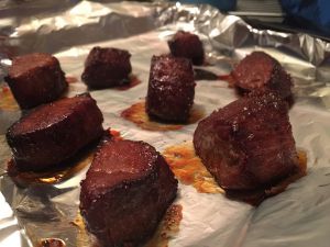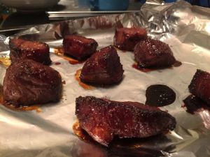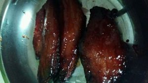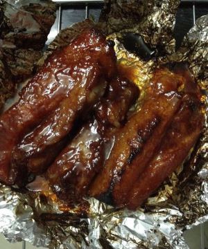 烤的时候再调制一点酱汁,将叉烧酱和蜂蜜按一比一拌匀,烤好后打开锡纸倒出多余酱汁油脂,小心烫手。然后将刚刚调制好的酱汁刷在叉烧上,再放打开的锡纸包回烤箱再烤8-10分钟,温度什么的和刚刚一样