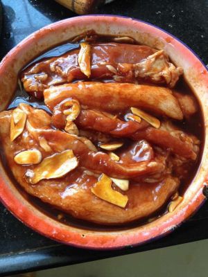 然后调酱汁。叉烧酱,蜂蜜,白糖,酒,盐一小茶匙,拌匀,调好后可以尝一下看是否合适自己口味了,不合适在此基础上适量增加。姜蒜切片放入酱汁中。再把肉放入调好的酱汁中腌渍。用保鲜膜密封放入冰箱冷藏24小时。