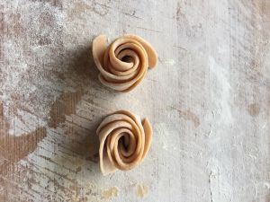 面团搓成长条,用刮板切成8份.用手拢成圆形,使其表面光滑。