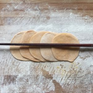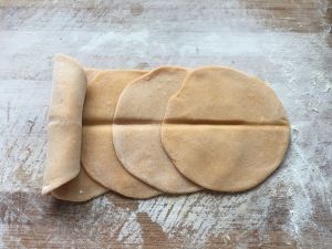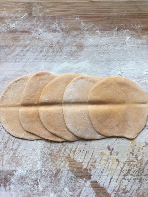 我选的砖块红糖(比袋装散装红糖口感好)切成小块后,加水上锅蒸化成红糖水,放凉后待用。加入自发馒头粉,揉匀后,发酵两个小时后,柔至面团光滑。均匀的分成小块,用擀面杖擀成圆形薄片,待用