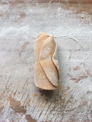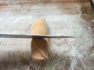 家里如果有压面机的话,就方便了 可以用压面机多压几次,反复折叠压好(看上图) 把压好的面片卷起来(如图) 如果没有压面机就用擀面仗吧 不用擀的太薄,反复擀平即可,卷好后多滚几下