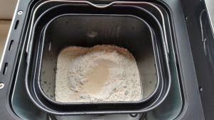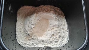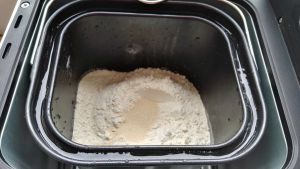倒入3平杯面粉, 尽量让面粉覆盖整个水面,面粉上扒一窝,放入1.5小勺酵母。