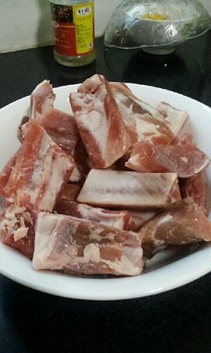 排骨切段,冷水下锅抄下,注意要开盖,待水开后坚持一分钟捞出沥干待用;