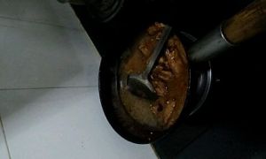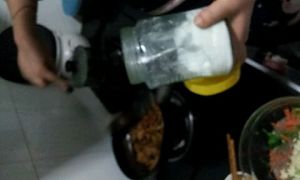 锅中下油,待油热后把花椒,大蒜,豆瓣还有泡椒泡姜全部放到锅中去炒。