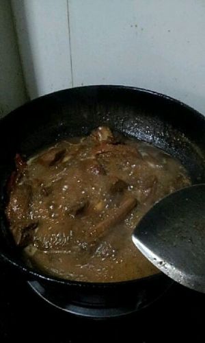 放入老抽,生抽,炒匀了放入开水,水莫过排骨高度就好