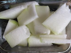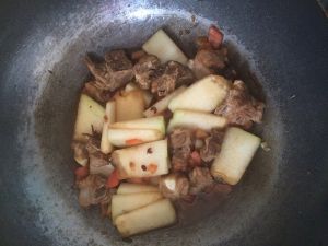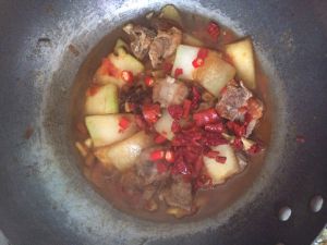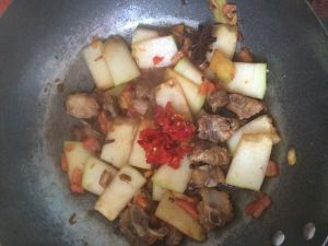 焖煮至冬瓜变软的时候,加干辣椒,最后调整一下味道,中火收汁