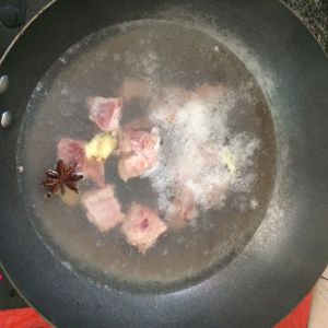 凉水放入斩好的排骨,放入几片姜片、八角一起烧开
