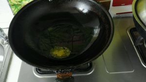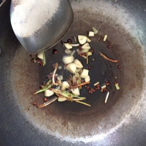 锅中热油,放入姜蒜花椒,(因为家里刚好剩了点葱白,就先将葱白煎了一下)