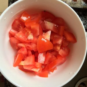 西红柿切丁(我因为偷懒,没有先将西红柿放入锅中划十字煮开去皮,直接切丁)