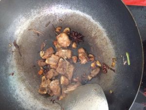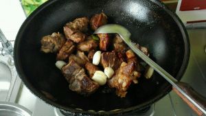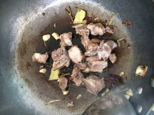 放入八角、香叶、干辣椒、焯好的排骨翻炒均匀至排骨都挂上漂亮的红色
