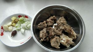 焯好的排骨盛出备用,葱切成葱花,姜拍松切粒即可,蒜拍松,草果喇开一个口,这样香料会更好入味