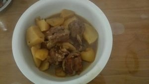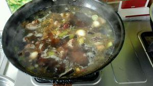 加肉汤、适量开水,放入桂皮、草果大火烧开炖10分钟转文火炖40分钟,我买的是嫩排骨50分钟就可以了!
