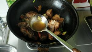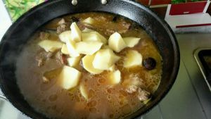 放入葱 姜 大料 胡椒 干辣椒,撒入料酒焖半分钟,加入没过肉的水,加入之前煎好的土豆块,倒入李锦记红烧汁