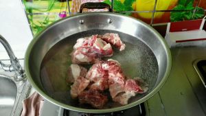 将排骨冷水下锅,点火烧开,把排骨中的血水焯净,也可以血沫撇干净,留肉汤一会儿炖排骨时添汤用,肉汤很香的