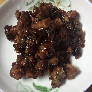 把炒过的蒜瓣放入排骨锅内,倒入香油,蚝油,大火收汁。出锅前撒入鸡精,装盘后撒入小葱。