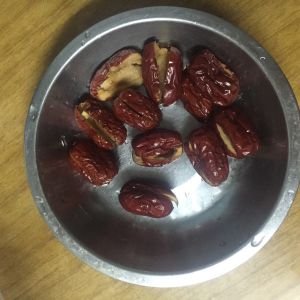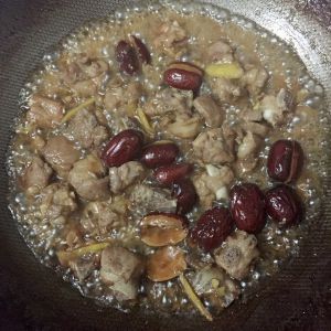 之后倒入红枣、红糖、姜丝、腌制排骨的汁、热水淹没食材,大火烧开转中火炖至变粘稠