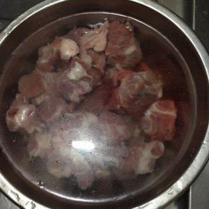 排骨洗干净,放入锅中加入冷水大火煮开进行焯水,煮开后30秒左右即可捞出,冷水冲干净备用。