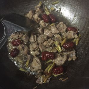 然后加入姜、八角、桂皮、干辣椒接着翻炒几下,再加入葱蒜继续翻炒,倒入两勺老抽、两勺生抽,两勺料酒继续翻炒2-3分钟至排骨表面均匀着色即可