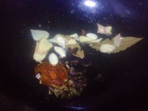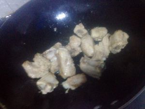 锅内倒入油,倒入敲碎的冰糖 ,熬至焦黄色,