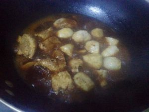 出锅前去掉葱加入适量酱油、蚝油,收干汤汁。