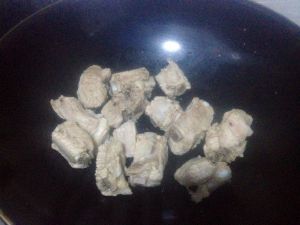 排骨从水中捞出来,不放油,开小火,去掉一些水分