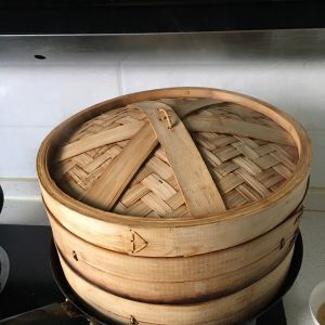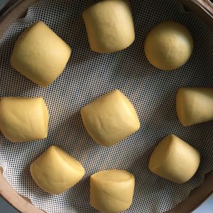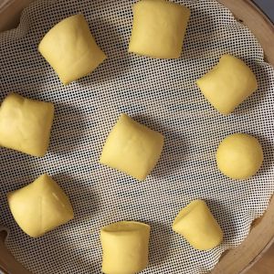 把面团放到蒸屉上,我用了硅胶垫,或者可以面团下面用一小块油纸垫一下