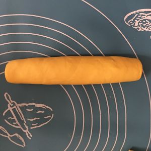 取一块面团擀成长方形,从一边卷起,卷紧一点