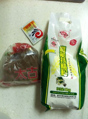 面粉500克,玉米面300克,糖和酵母粉用温水化开。