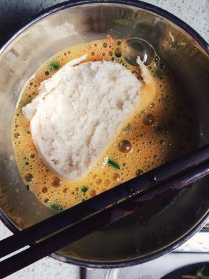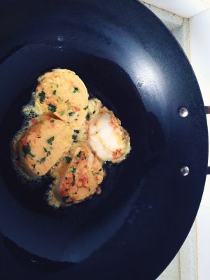将馒头片放入蛋液中翻滚,保证整片馒头都裹上蛋液和菜