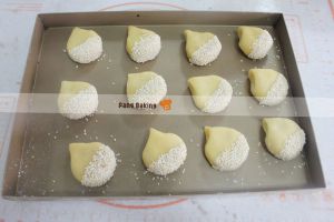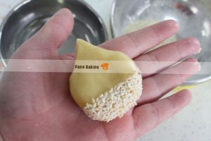 将面团的另一端浸入水中,沥去多余水份手,沾些白芝麻
