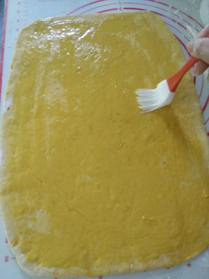 把排完空气的面团擀成一个长方形,记住不能擀得太薄。然后在面团上均匀的刷上一层食用油。