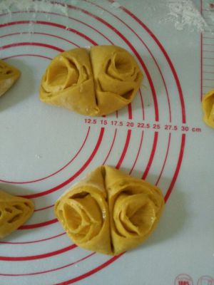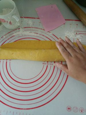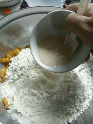 把压好的南瓜泥倒入一个大点的盆子里,加上面粉,再加入化开了的酵母。揉成光滑的面团。(因为南瓜里面含的水分比较多,所以根本就不用加水。)