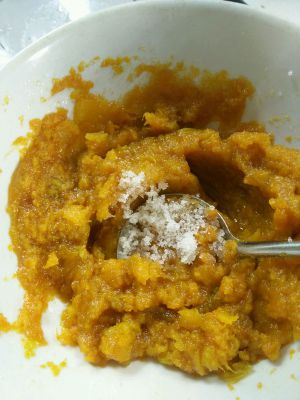 蒸熟后的南瓜倒去水分,趁热加上白糖用勺子压成南瓜泥。