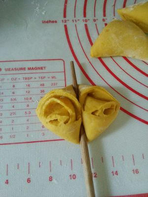 然后把切好的三角形南瓜卷立起来,用一根筷子从三角形的顶上压下去(现在知道刚才为什么切三角南瓜卷的时候顶上要留个和筷子一样宽的宽度了吧)