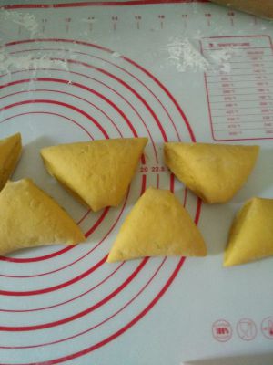 把卷好后的南瓜卷切成如图状的三角形,记住每个三角形的顶上一定要留和筷子一样宽的宽度。
