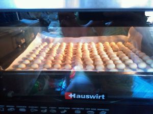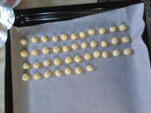 烤盘铺上油纸,粉图揉成比黄豆大一点,这样看出来更加酥脆,揉得很累
