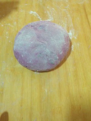 把紫薯碾成泥,把泡打粉紫薯泥面粉掺在一起放点水。发酵一个小时半。