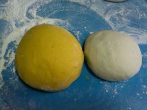 把两种面团擀平,叠起来(想要哪种颜色在外面就把它放下面)